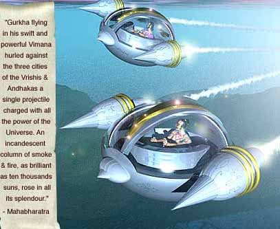The Mahabharata also tells of the awesome destructiveness of the war: "... (the weapon was) a single projectile charged with all the power of the Universe. An incandescent column of smoke and flame as bright as the thousand suns rose in all its splendor... An iron thunderbolt, a gigantic messenger of death, which reduced to ashes the entire race of the Vrishnis and the Andhakas.... the corpses were so burned as to be unrecognizable. The hair and nails fell out; pottery broke without apparent cause, and the birds turned white.... after a few hours all foodstuffs were infected.... to escape from this fire, the soldiers threw themselves in streams to wash themselves and their equipment..." Some say that the Mahabharata is describing an atomic war. References like this one are not isolated; but battles, using a fantastic array of weapons and aerial vehicles are common in all the epic Indian books. One even describes a Vimana-Vailix battle on the Moon! The above section very accurately describes what an atomic explosion would look like and the effects of the radioactivity on the population. Jumping into water is the only respite.
