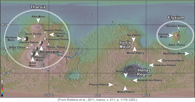 Plains with abundant lava flow features occur in and around the large volcanic provinces of Tharsis and Elysium.