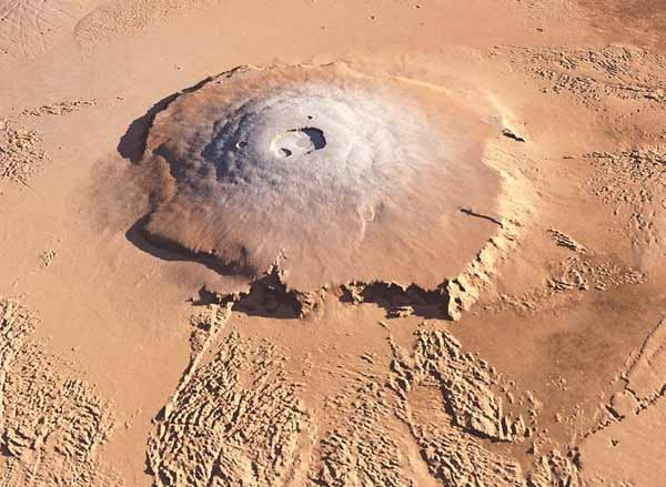 The largest and most conspicuous volcanoes on Mars occur in Tharsis and Elysium regions. These volcanoes are strikingly similar to shield volcanoes on Earth. Both have shallow-sloping flanks and summit calderas. The main difference between Martian shield volcanoes and those on Earth is in size: Martian shield volcanoes are truly colossal. For example, the tallest volcano on Mars, Olympus Mons, is 550 km across and 21 km high.