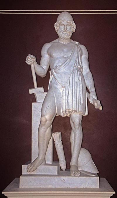 Through his identification with the Hephaestus of Greek mythology, he came to be considered as the manufacturer of art, arms, iron, jewelery and armor for various gods and heroes, including the thunderbolts of Jupiter. He was the son of Jupiter and Juno, and husband of Maia and Venus. His smithy was believed to be situated underneath Mount Etna in Sicily. As the son of Jupiter, the king of the gods, and Juno, the queen of the gods, Vulcan should have been quite handsome, but, baby Vulcan was small and ugly with a red, bawling face. Juno was so horrified that she hurled the tiny baby off the top of Mount Olympus.