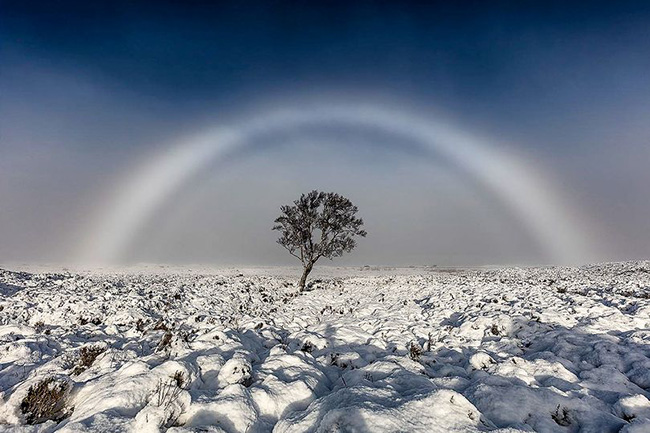 The beautiful 'fog bow' stunned onlookers with its magical aura shining against the bright blue sky. The rare white rainbow was captured on Rannoch Moor in Scotland. The image from Rannoch Moor in the west of Scotland was captured by Melvin Nicholson. Out walking on the moor, south of Glen Coe, he said the unbelievably beautiful white rainbow appeared before him. It is a colorless rainbow that is made up of tiny water droplets that cause fog.