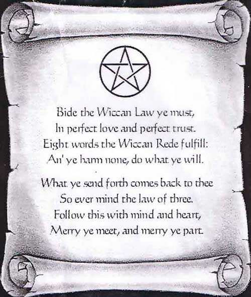 Wiccan morality is ruled according to the Wiccan Rede, which (in part) states "An it harm none, do what thou wilt." ("An" is an archaic word meaning "if".) Others follow the slightly adapted Rede of "An it harm none, do what ye will; if harm it does, do what ye must." Either way, the Rede is central to the understanding that personal responsibility, rather than a religious authority, is where moral structure resides.One of the major differences between Wiccans and other types of witchcraft is the Rede.