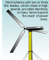 The multi-bladed wind turbine atop a lattice tower made of wood or steel was, for many years, a fixture of the landscape throughout rural America. These mills, made by a variety of manufacturers, featured a large number of blades so that they would turn slowly but with considerable torque in low winds and be self regulating in high winds.