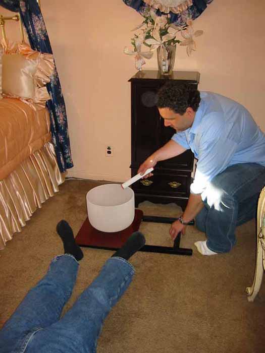 Beginning with the C bowl, root/first chakra, students experienced a flood of spirits entering the room as if a door had opened and they had merged with another reality. One could hear the whispers of entities talking to each other. Most of these entities were not connected to the students in the workshop. The experience was about viewing an endless line of spirits passing by. It reminded me of 9/11, viewing many souls in transition, seen as projected illusion within their reality running parallel to our own.