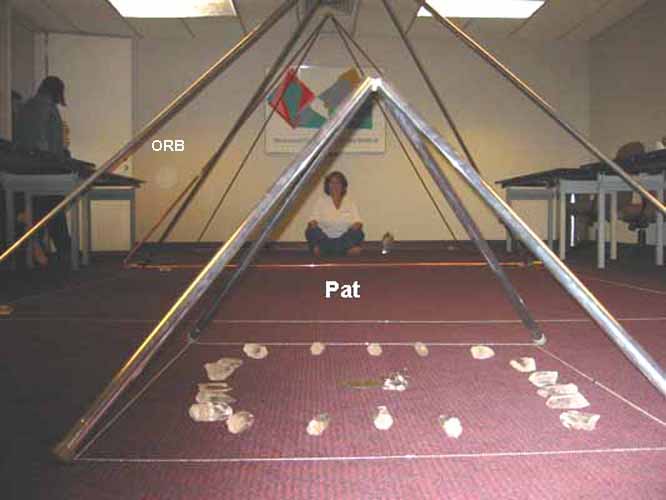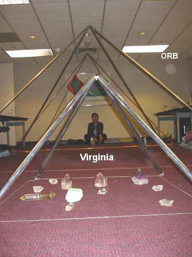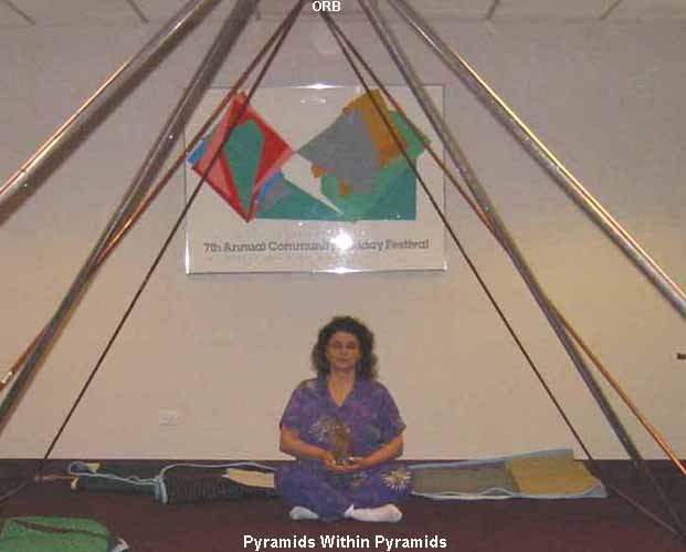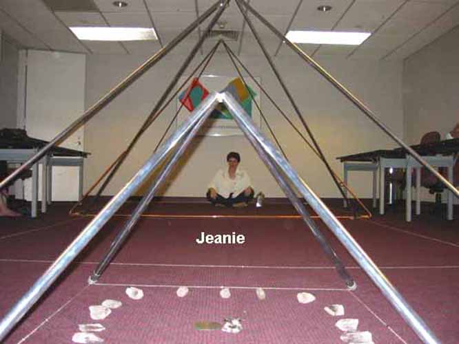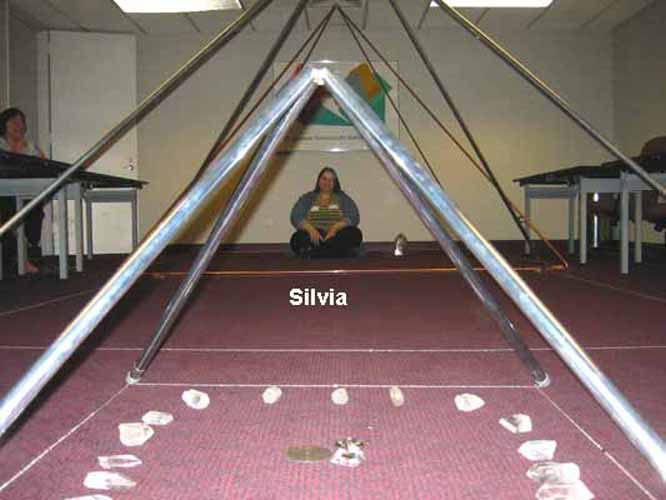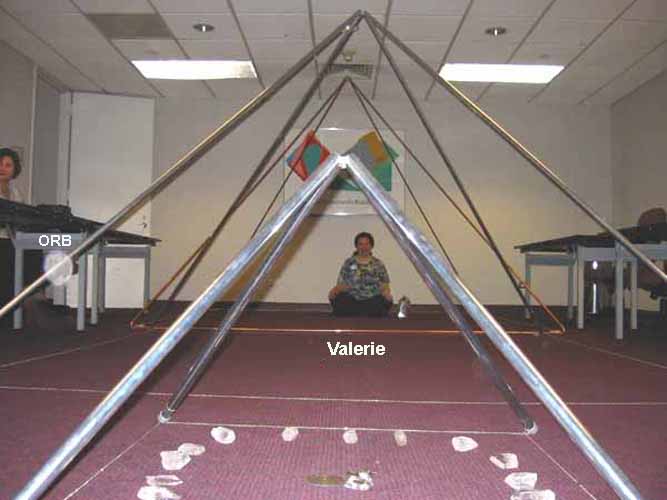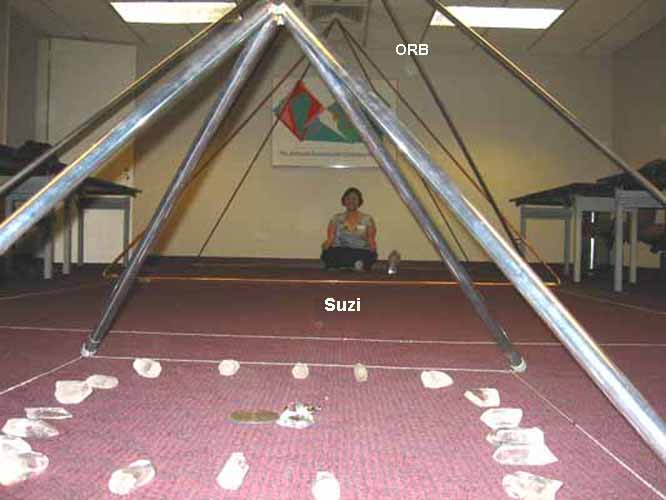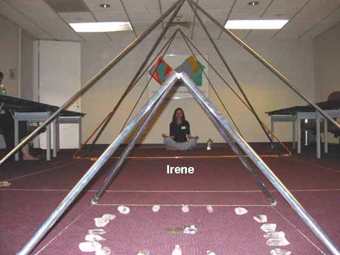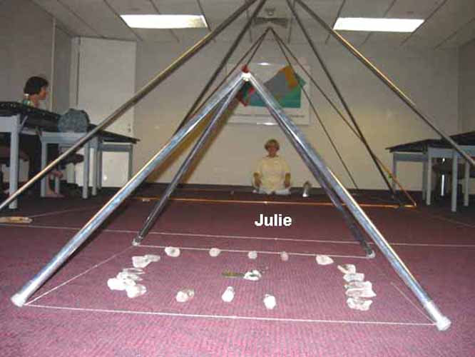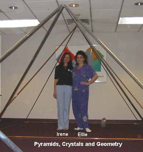 After introducing ourselves, the class began. Each person selected their crystal, prepared and energized in EllieÕs home, the week before the class. At 11:11 we all entered the 2 larger pyramids for a meditation of the summer solstice. This was a guided meditation, with soft music and the energies of crystals of various sizes and shapes adding to the energies. Ellie's instructions were to connect with our spirit guides or angels. Immediately, I began to fly. I magically found myself flying beside Jose, my husband of 36 years. We flew free, with no wings, just completely free toward the sun. We joyfully flew through an ocean of twinkling lights toward a sun but surprisingly there was no heat. We sailed through open space together, enjoying the peace and love that surrounded us. When the time came to return I realized that all this wonderful space was out there but at the same time all contained within the boundaries of my being. The crystal, which I held tightly in my hand, vibrated to make me aware of its presence.