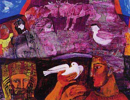 Pigeons are depicted in paintings and sculptures in almost every culture and religion in the history of the Earth, including such ancient places as Babylon, Palestine, Egypt, Assyria, Israel, Greece, and Rome. Pigeons, especially white ones, figure prominently in the Bible. Apparently it was a white pigeon and not a dove that Noah was said to have released from his ark and which later returned with an olive branch. Those so-called doves of peace you see in various publications and paintings are actually white pigeons. In some places pigeons have been used as symbols of love, fidelity, femininity, virtuous parentage, innocence, purity, speed, and the postal service. Their expressive eyes and their habit of tender billing (the equivalent of kissing) have symbolized erotic love to many artists. Picasso often featured pigeons in his paintings.