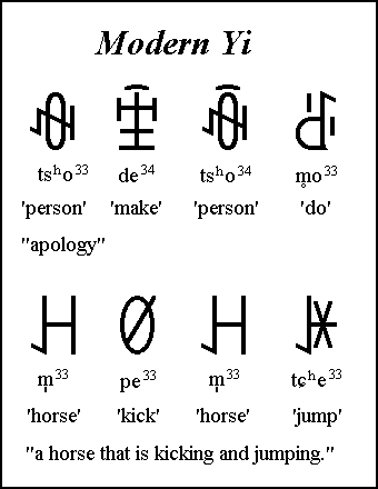 After 1970, a popular proposal introduced a "simplified" form of the Yi script. Taking 819 characters from the Classic script, "Modern Yi" is simply a syllabary. The Yi language is monosyllabic in the form of (Consonant Cluster)-Vowel. However, it allows 43 different consonant clusters to occur before the vowel. In addition, Yi is a tonal language, with 5 contrastive tones. The little double-digit numbers that you see after the phonetic transcription of a Yi sign designates its tone, where 5 is highest and 1 is lowest. Only 3 tones is indicated in the syllabary, (55), (33), and (21). The tone (34) is represented by the same sign for (33) plus an arch above it. Yi Script