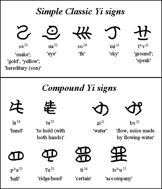 Like archaic Chinese, homophonous (same-sounding) words in Yi can also be represented by the same sign. For example, in the picture below, the sign for 'snake' is also used to represent 'gold', 'yellow', and 'hereditary (son)'.