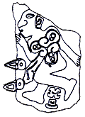 Inverted sign, usually a head, but this time an inverted glyph that might represent a god of the conquered town (according to Alfonso Caso). Inverted motifs in Mesoamerica traditionally mean "defeat", "ruin", etc.