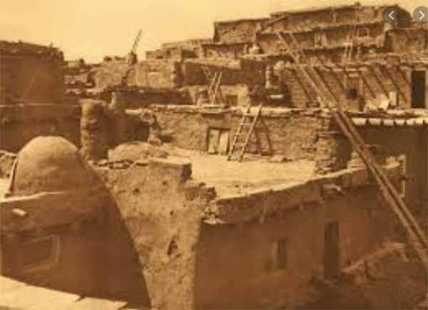 Houses are built of fragments of stone, set sometimes without binding material and without breaking joints. The walls are plastered on both sides with clay and whitened on the inside with gypsum wash. The flat, slightly sloping roof of brush and earth is supported by heavy pine beams stripped of their bark but not dressed. The quarters of a family are an apartment in a terraced structure containing hundreds of rooms. Houses on the ground level were formerly entered through the roof by means of ladders. The upper levels are either reached by ladders or by stone stairs ascending from one roof to another.